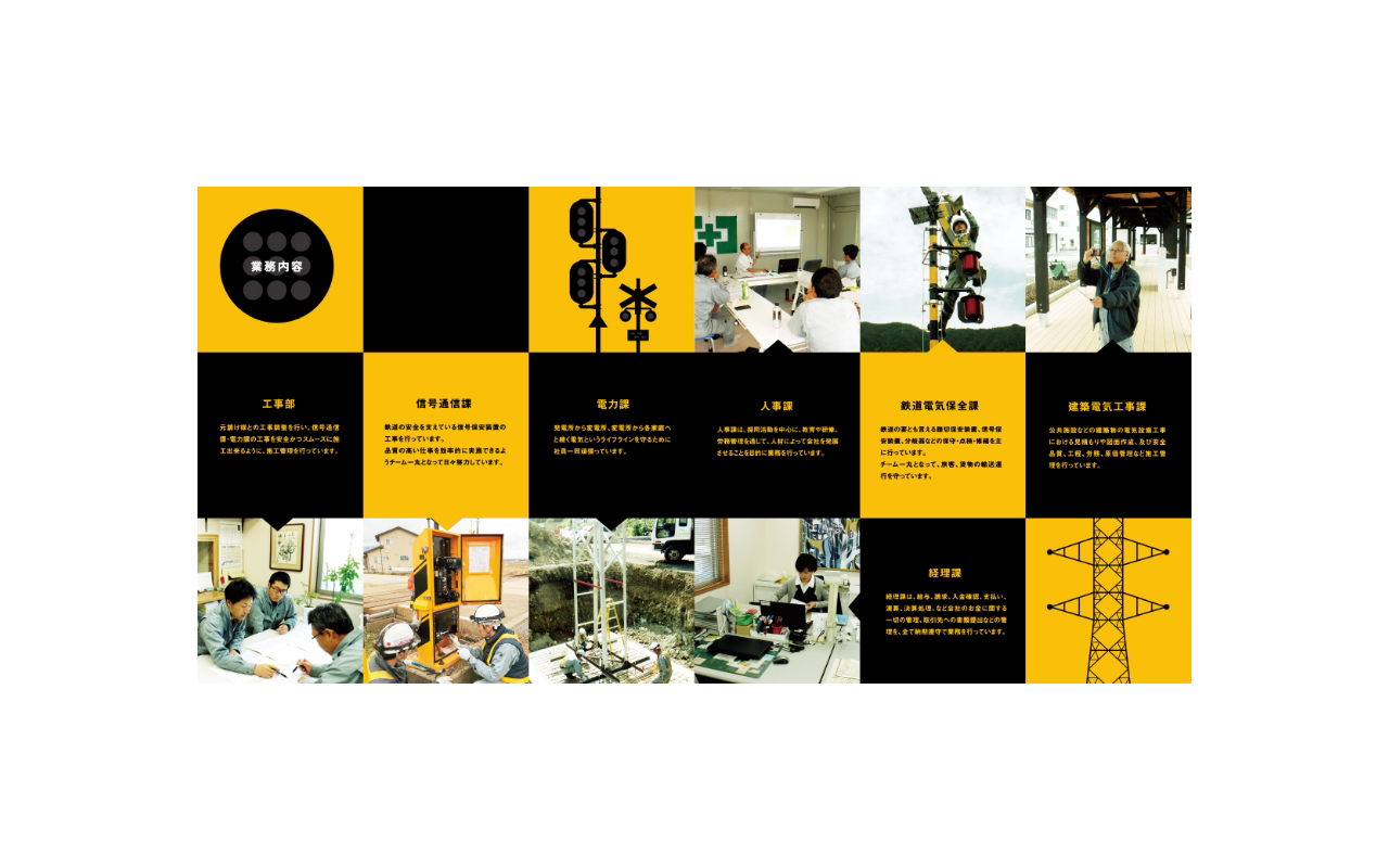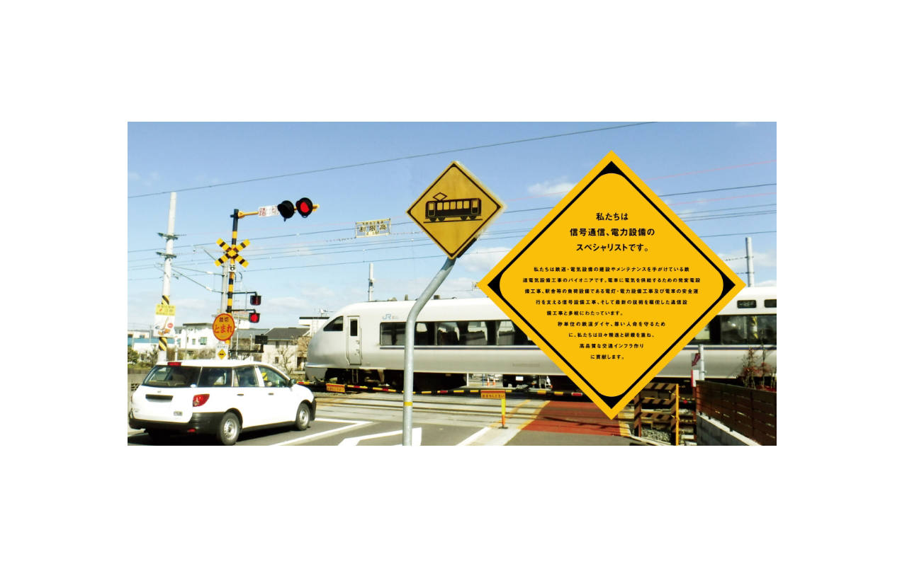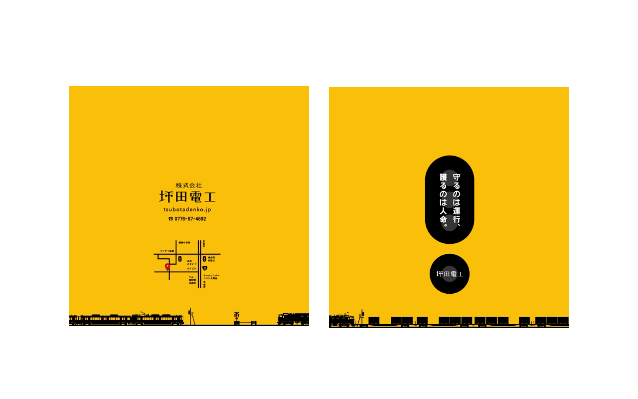 坪田電工は鉄道の信号や電気機器を扱う会社です。そして、今回一連のデザインにおいては学生のリクルートを前提としておりますので、10代の人たちにもわかりやすく「踏切」「電気」を想起させるロゴマークを作成しました。パンフレットやWEBサイトに関しても分かりやすいビジュアルと文字使いにこだわってみました。