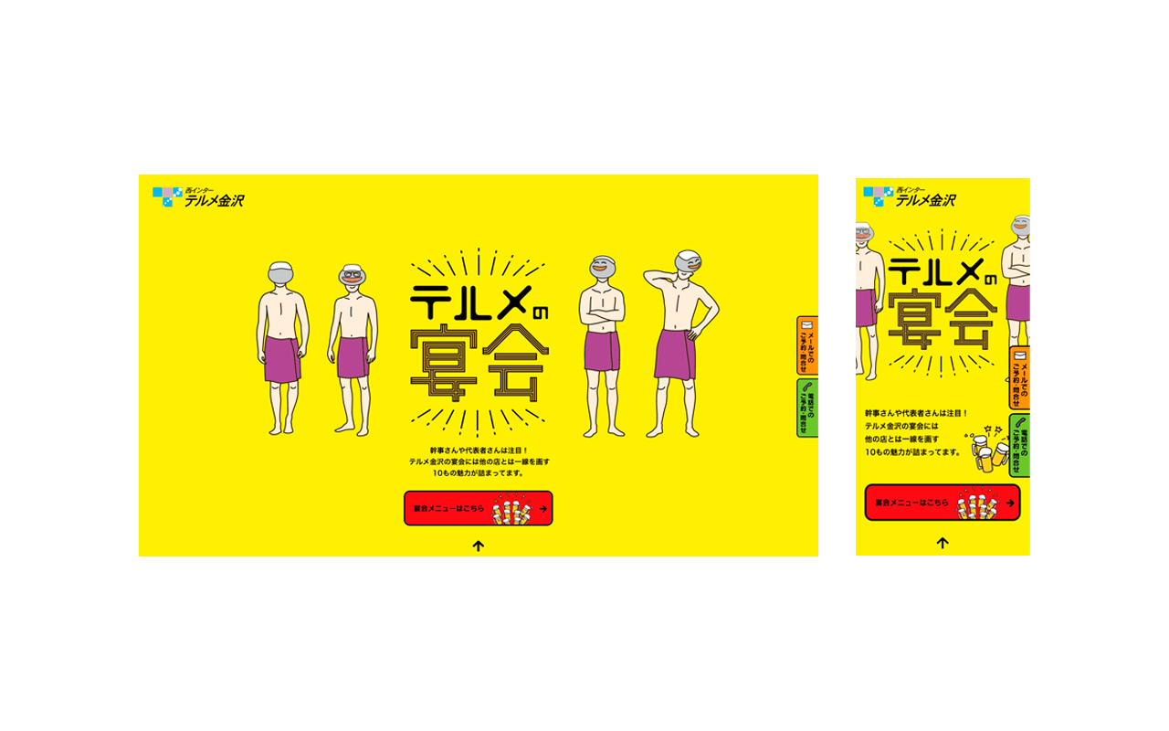 大浴場とサウナが自慢の、裸天国テルメ金沢。実は料理も自慢で華やかな宴会料理もお手のもの。そこでテルメの魅力満載な宴会の販促企画を提案しました。テルメの宴会らしく、仕事後の解放感とざっくばらんな裸の付き合いをそのまま表現しました。ただし、実際に裸で館内をうろついたら注意されるのでお気をつけください。
