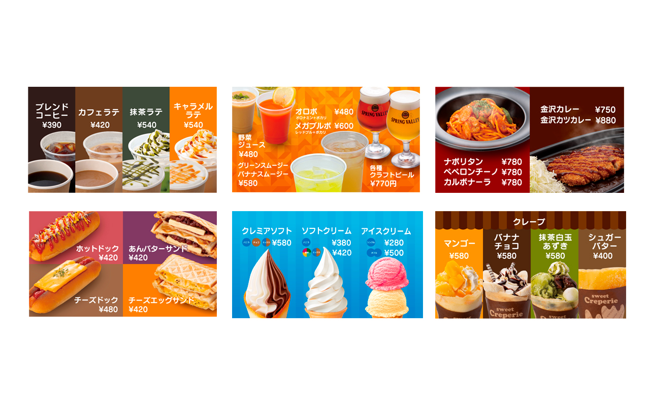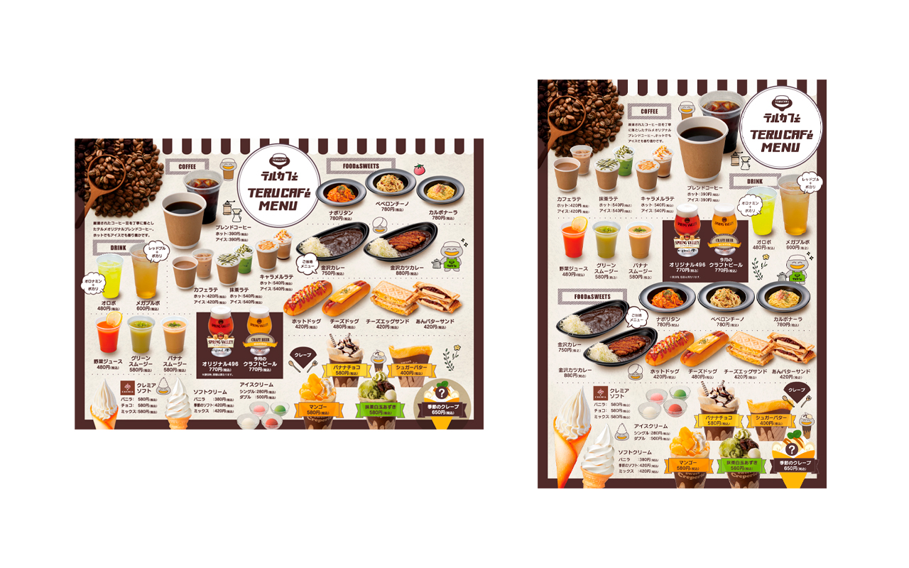 2024年テルメ金沢リニューアル時にオープンしたモダンな待合スペース前のカフェ&物販コーナー。店舗の雰囲気に合わせて、ロゴマークはテルちゃんとコーヒー豆とカップから溢れるコーヒーを合体させてみました。メニューやポップはデザインというよりは視認性の良さや美味しそうに見えることに重点を置いています。