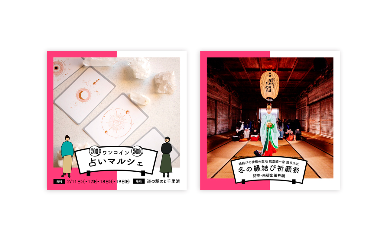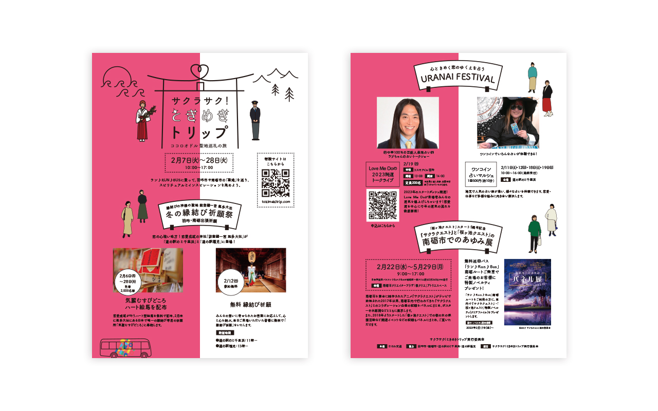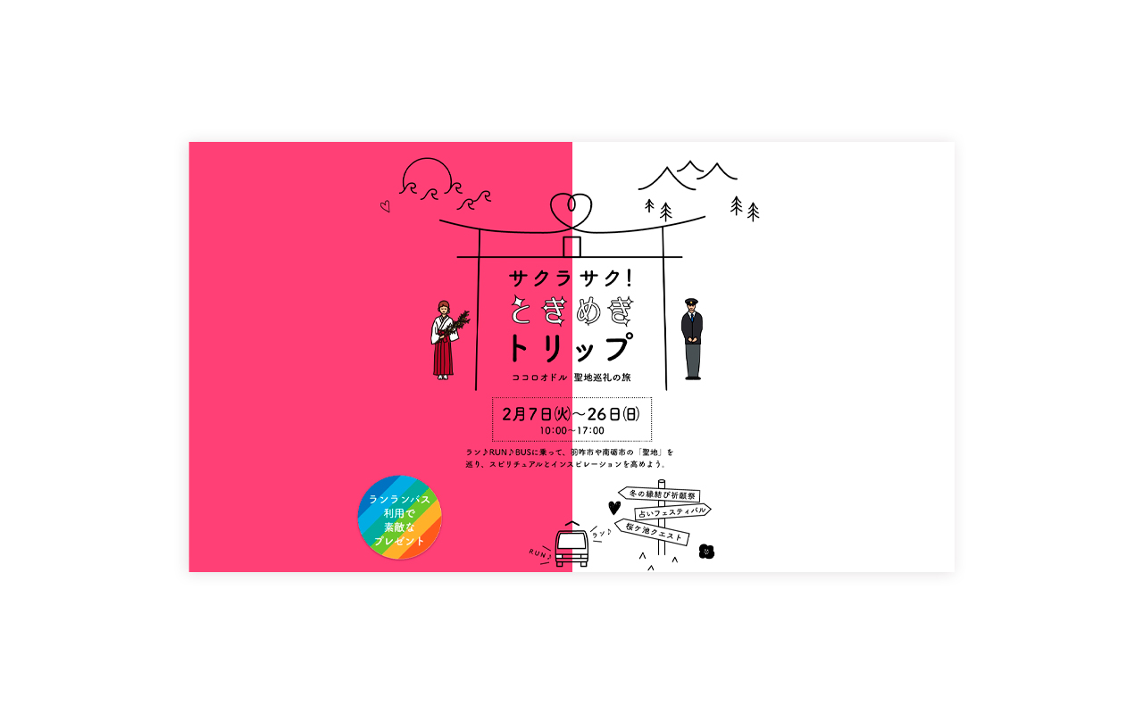 羽咋市と南砺市が共同で開催した氣多大社と桜ヶ池クリエ(P.A.WORKS)をめぐる巡礼イベント企画です。「true tears」と「サクラクエスト」に没入感と喪失感を感じた鈴木としては、けっこう楽しそうで幸せそうなイベントだなと思い、羽咋側を恋の「紅」南砺側を作画用セルの「白」という縁起のいい紅白にして、あとはシンプルにまとめました。